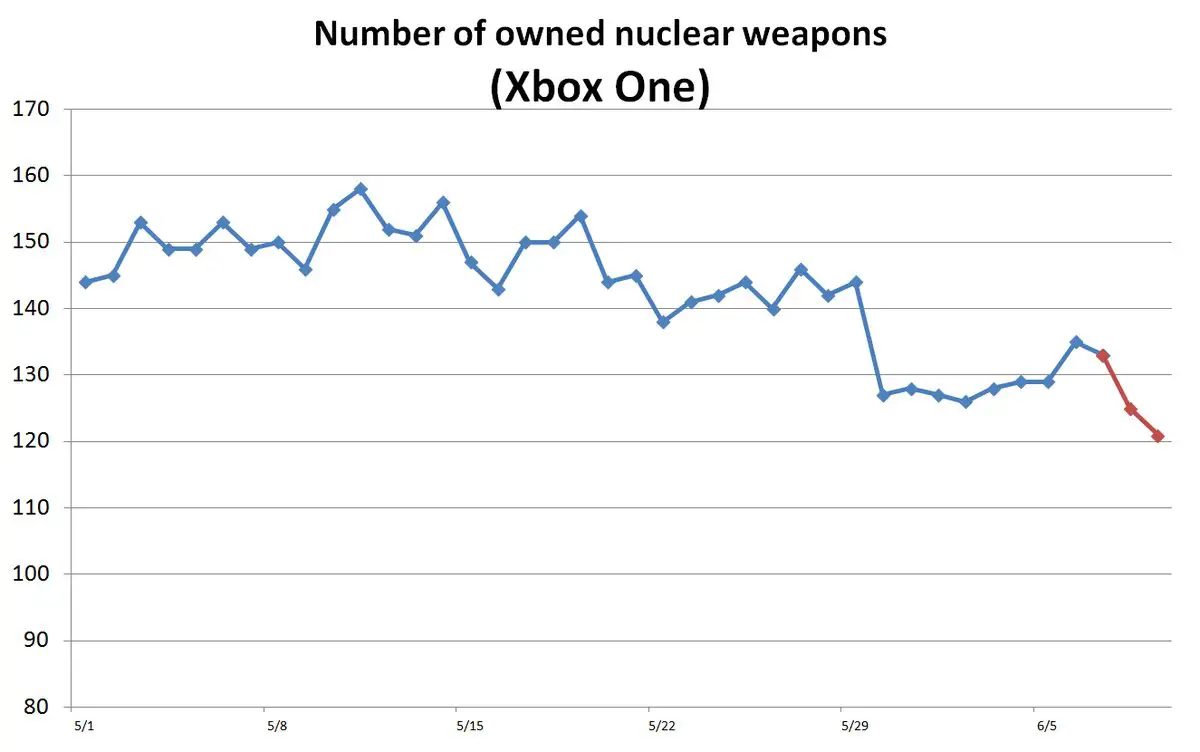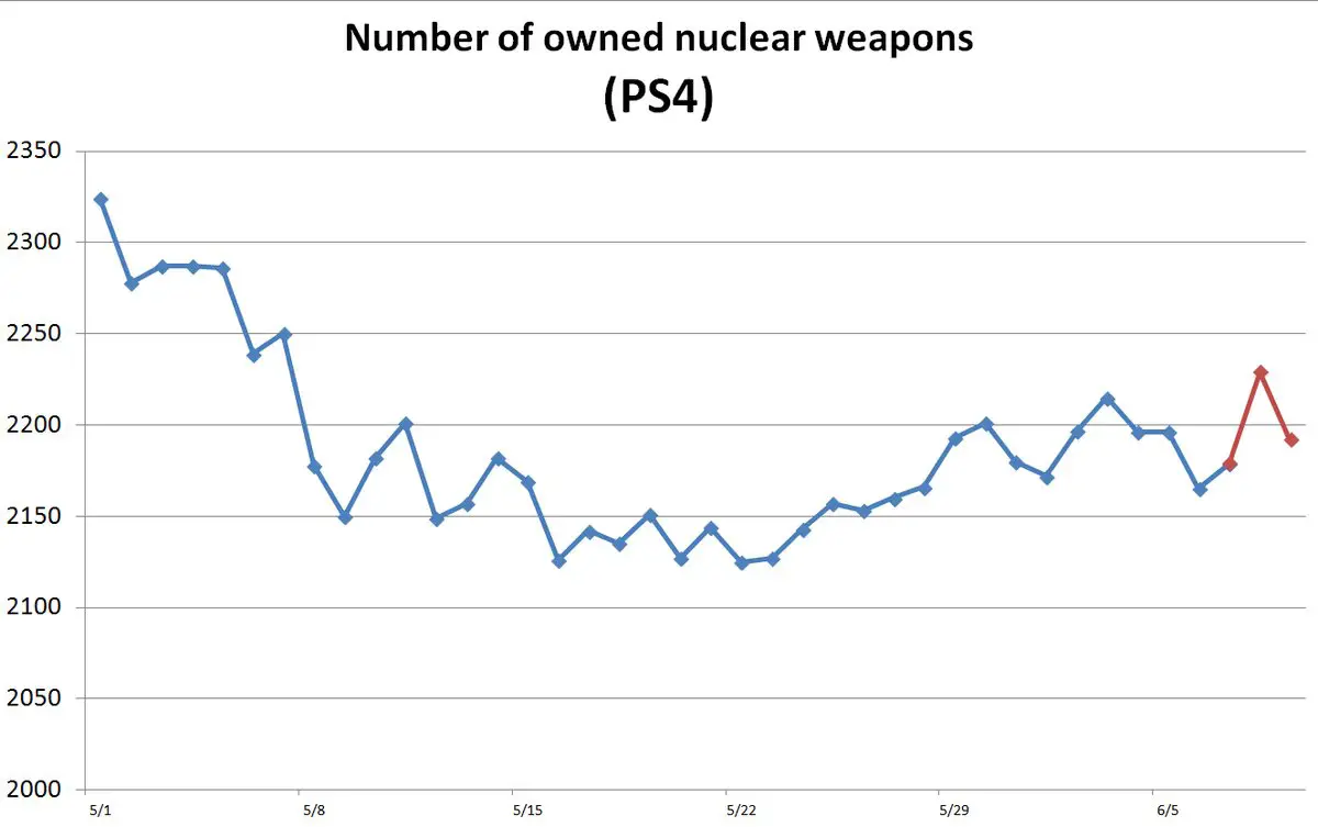As you can see there was a slight increase on PlayStation 4, but all of the other platforms saw a decrease, with quite a dramatic change on Steam and Xbox One, as is evident from the graphs. This may have something to do with the anti-cheat measures Konami has introduced on June 6th – though, unfortunately, the company did not specify what these measures are exactly, and if they also affect unfairly obtained nukes that already existed.