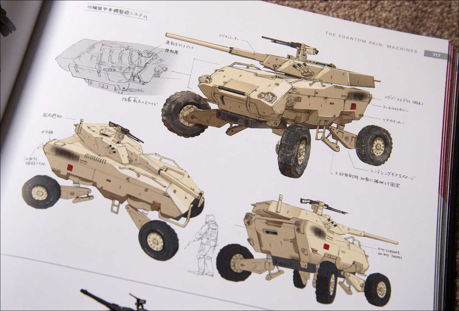 As you would expect the majority of the book is filled with art for The Phantom Pain. There are all kinds of different visuals, from the various weapons, gadgets and vehicles to character sketches and locations.