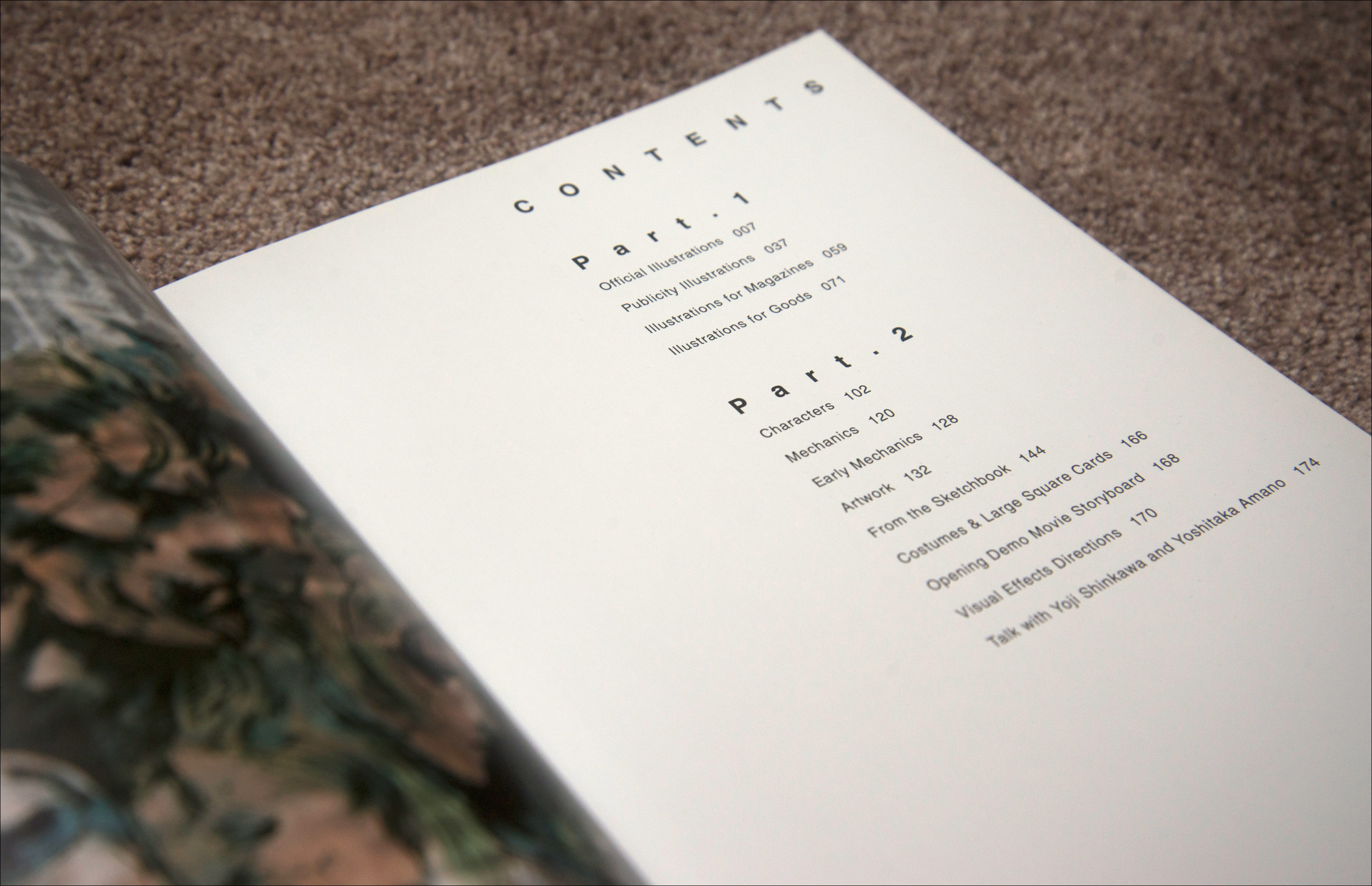 The 179-page book is divided into two parts. Part 1 contains official illustrations, publicity illustrations, illustrations for magazines and illustrations for goods. Part 2 focuses on work that was used during production: characters, mechanics, early mechanics, artwork, drawings ‘from the sketchbook’, costumes and large square cards, the opening demo movie storyboard, visual effects directions and a talk with Yoji Shinkawa and Yoshitaka Amano (in both Japanese and English). At the very beginning of the book is a fold-out artwork of Meryl Silverburgh.