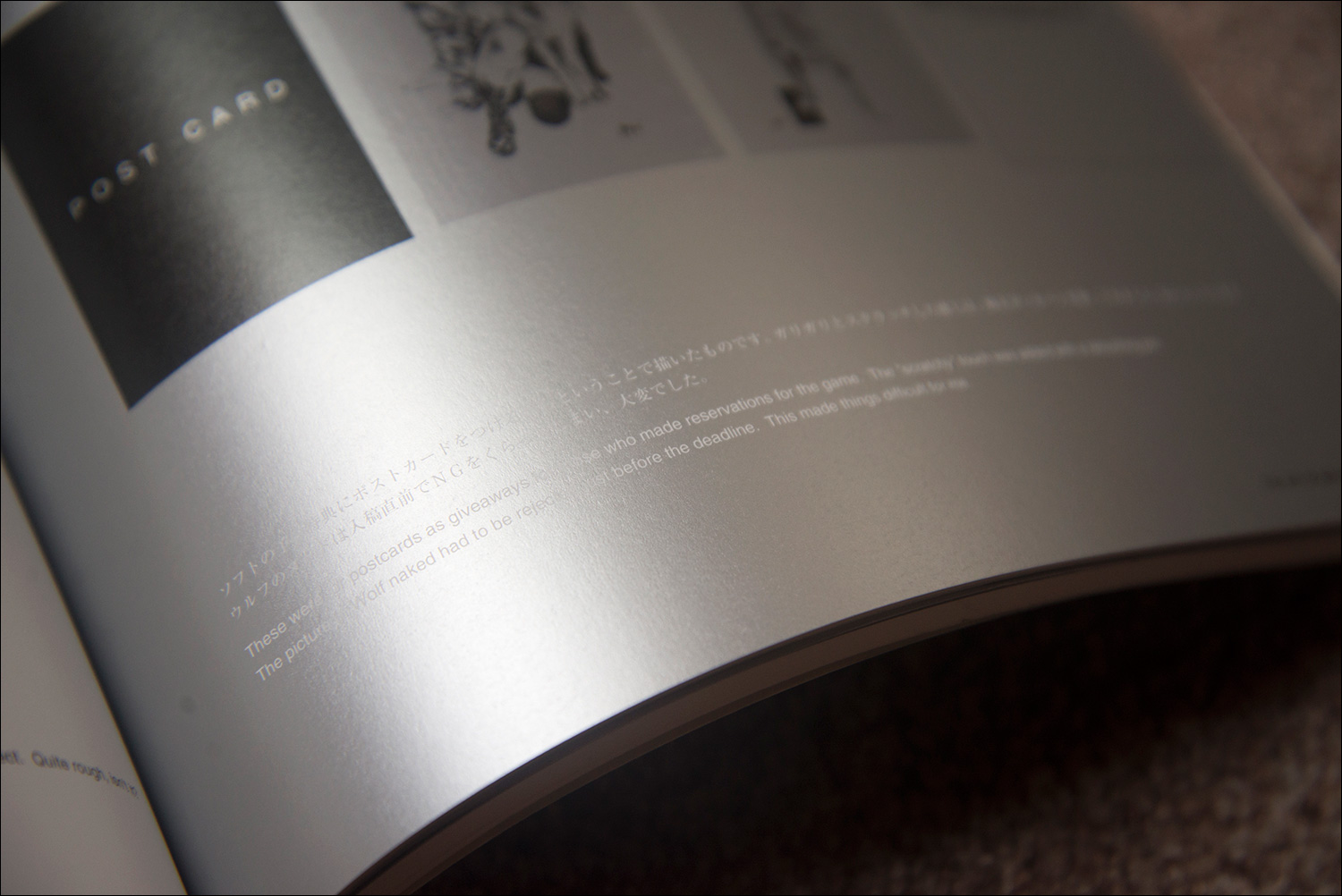The book itself is designed very well, with full page prints containing colorful artwork and black and white sketches, its chapters separated by semi-transparent title pages. Some of the illustrations are accompanied by small comments by Shinkawa in both Japanese and (imperfect) English that give some insight into the design process and the context they were used in. Glossy silver printing is applied throughout the book in both the artworks, the borders and lettering.