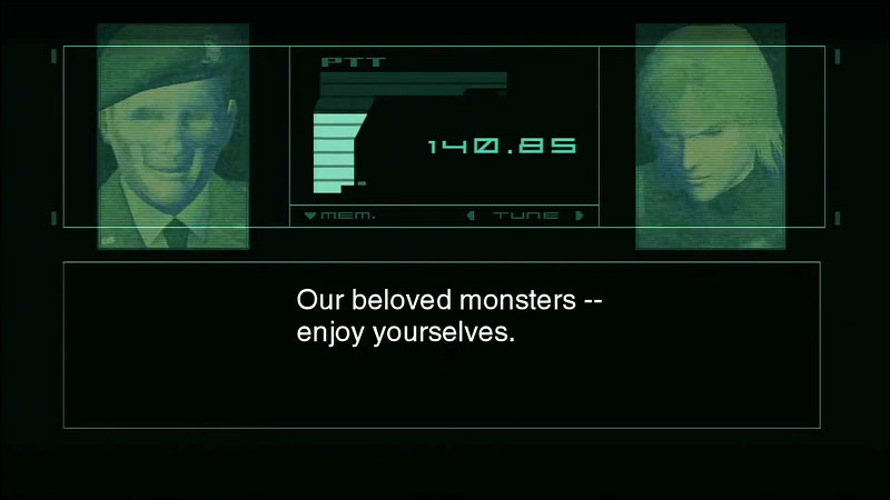 Of course one very important fabricated reality playing a huge role in the game is that of the simulation. The whole mission ends up being a simulation, a recreation of Shadow Moses. Even Raiden’s commanding officer, the man he’s been talking to the whole time, turns out to be simulated. He is an AI, an artificial intelligence, a simulation of intelligence or, as Solid Snake puts it: “The Patriots are a kind of ongoing fiction too, come to think of it…”. And this fiction orchestrated Raiden’s mission. ‘Complete your mission, according to the simulation.’ The Dead Cell unit simulate the FOXHOUND unit (before they simulated terrorist threats), and Big Shell simulates a clean-up facility.