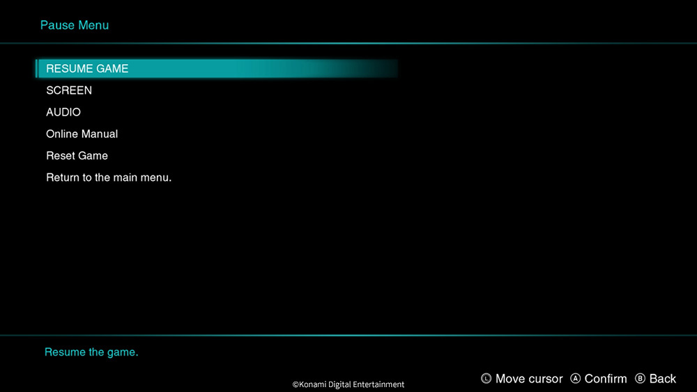Audio settings, screen settings (Steam® only), the online manual, resetting the game, and returning to the main menu can now be accessed via the pause menu.