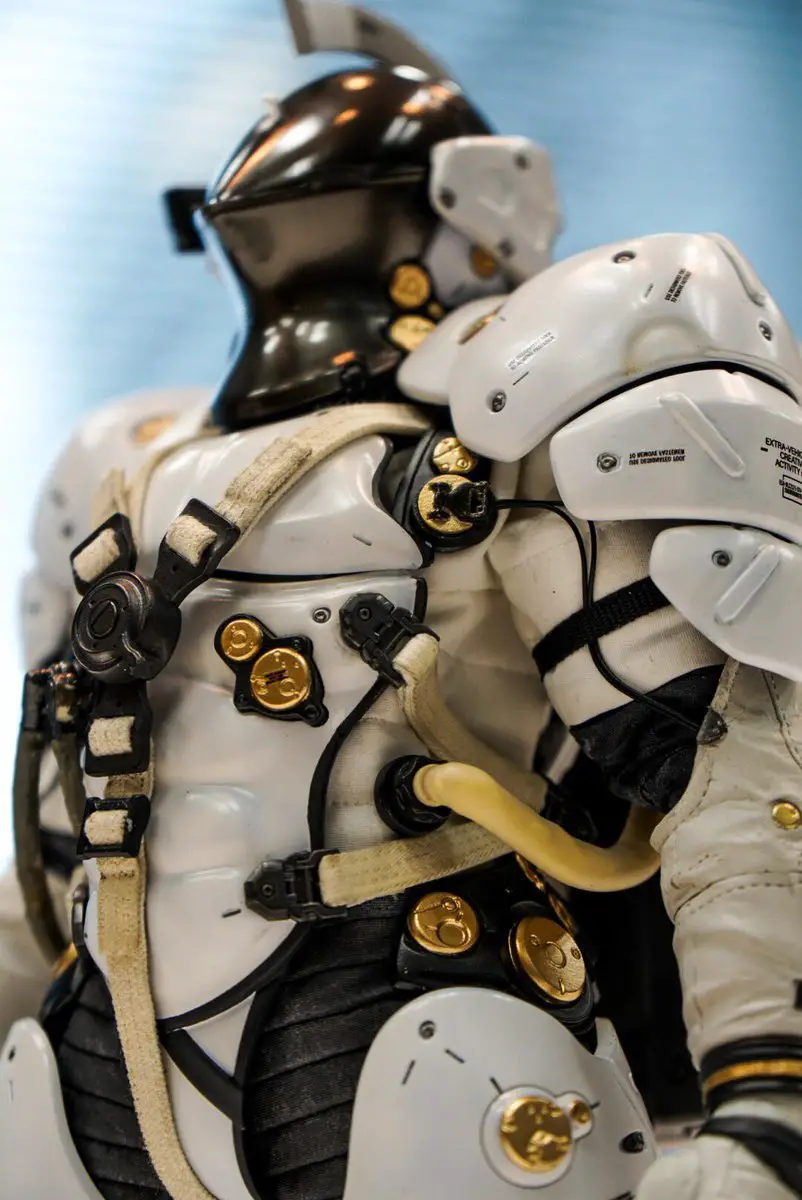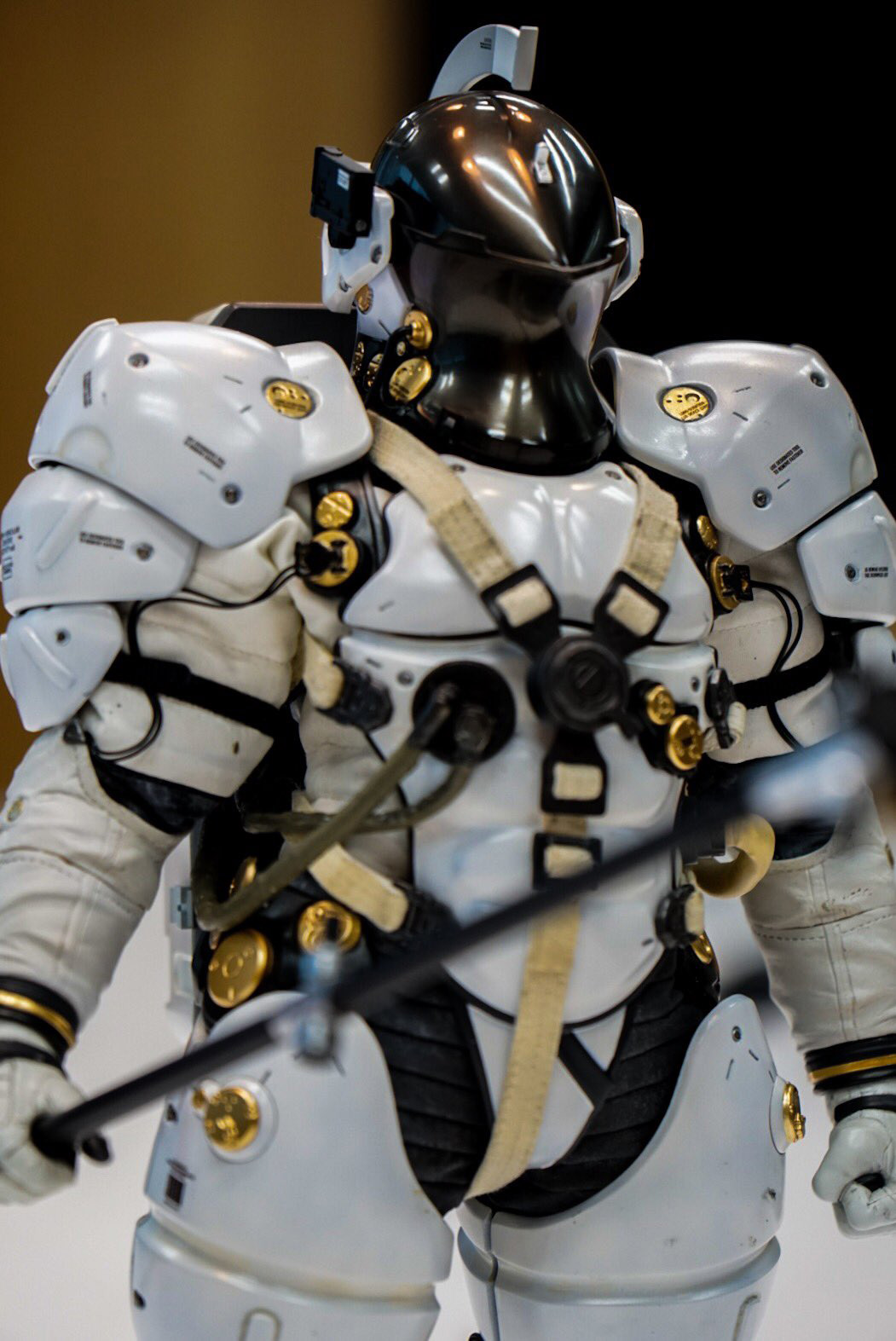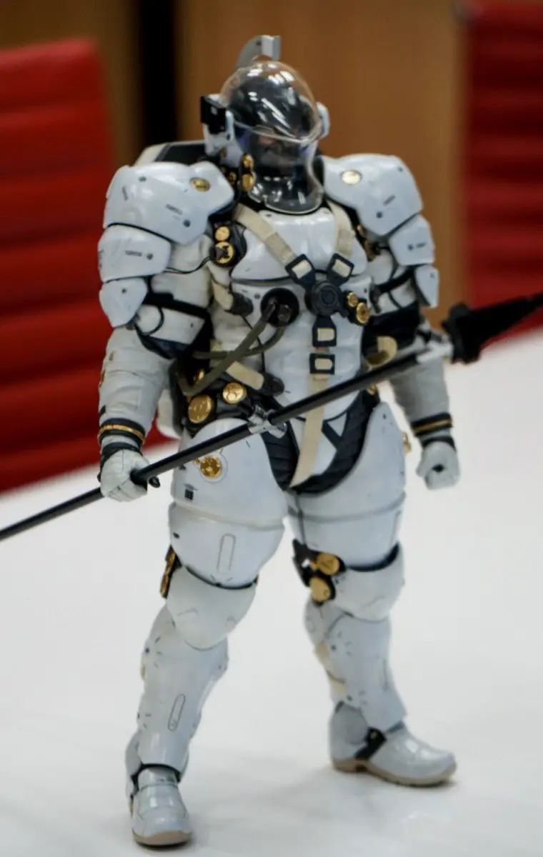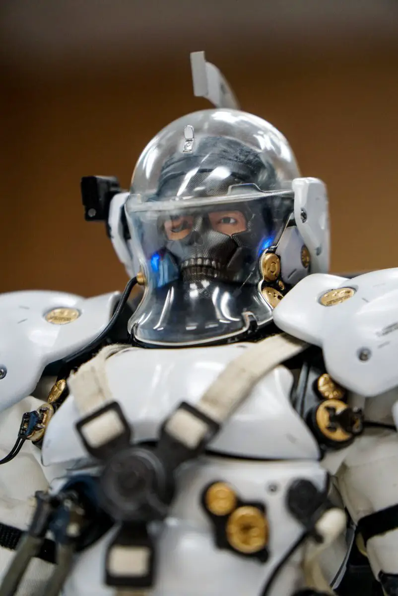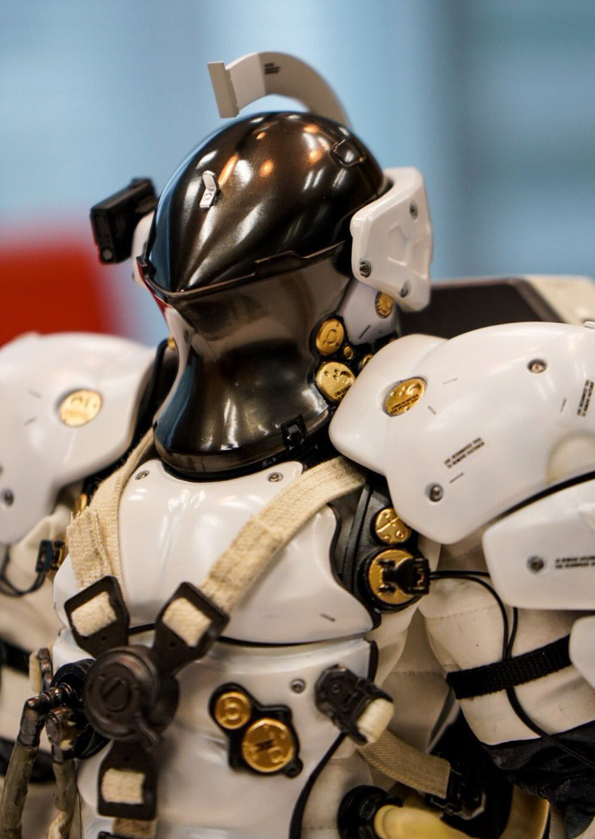 The Ludens action figure by Sentinel has arrived at Kojima Productions for checking, and Kojima shared some pictures of the new results. The 30 cm (~12″) figure has two types of visor (clear and black) and blue lights inside the helmet can light up. The eyes in the face can move as well.