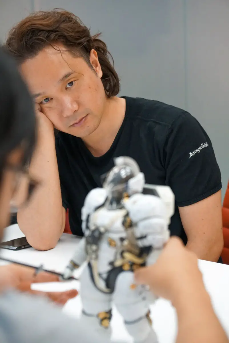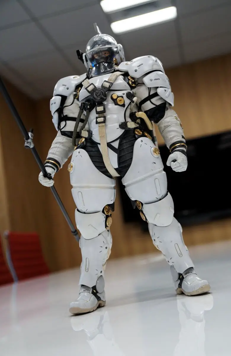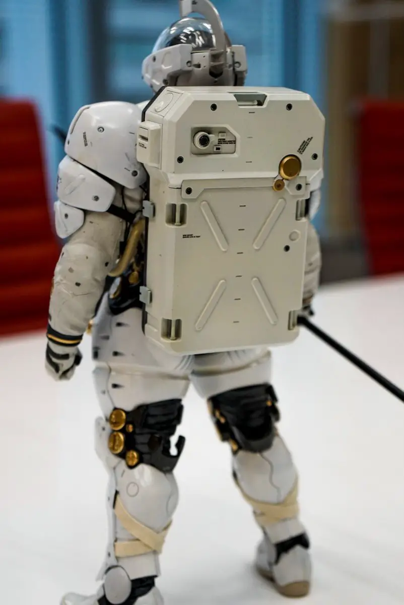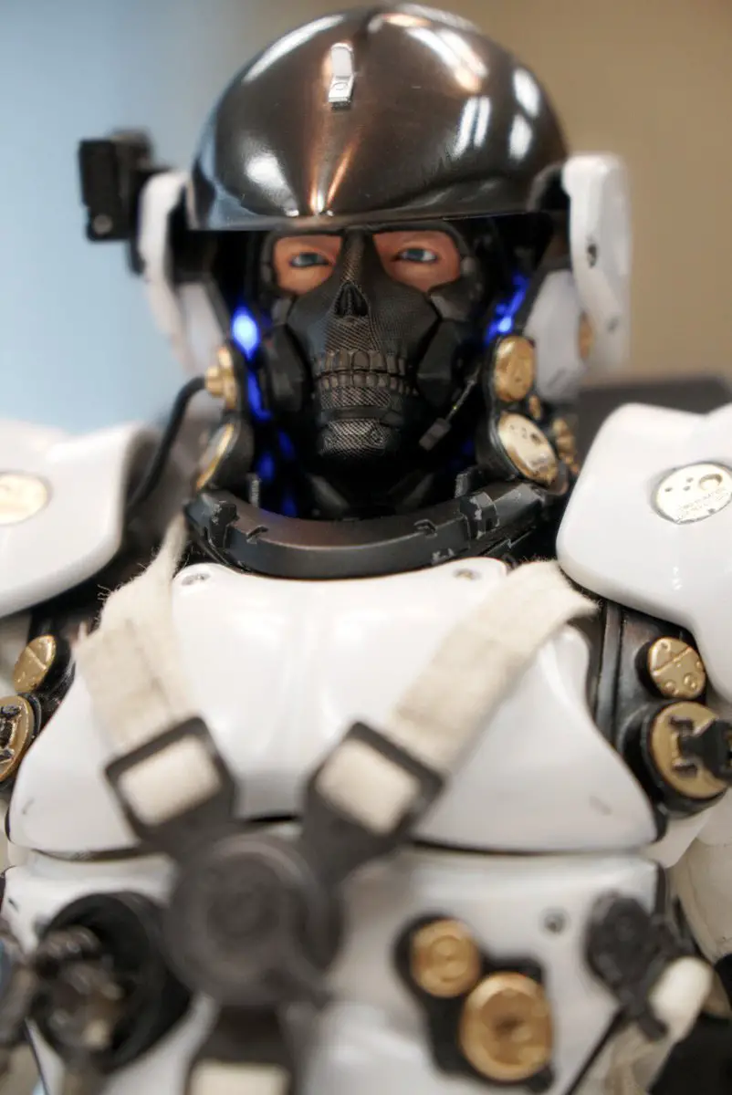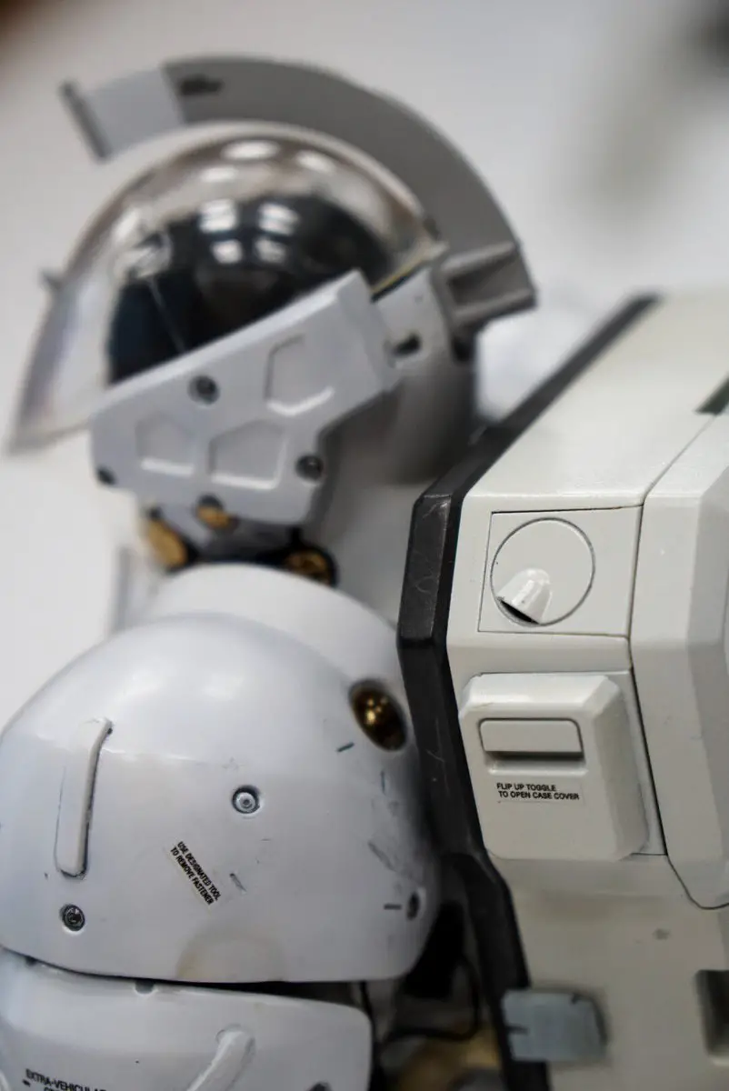 The Ludens action figure by Sentinel has arrived at Kojima Productions for checking, and Kojima shared some pictures of the new results. The 30 cm (~12″) figure has two types of visor (clear and black) and blue lights inside the helmet can light up. The eyes in the face can move as well.