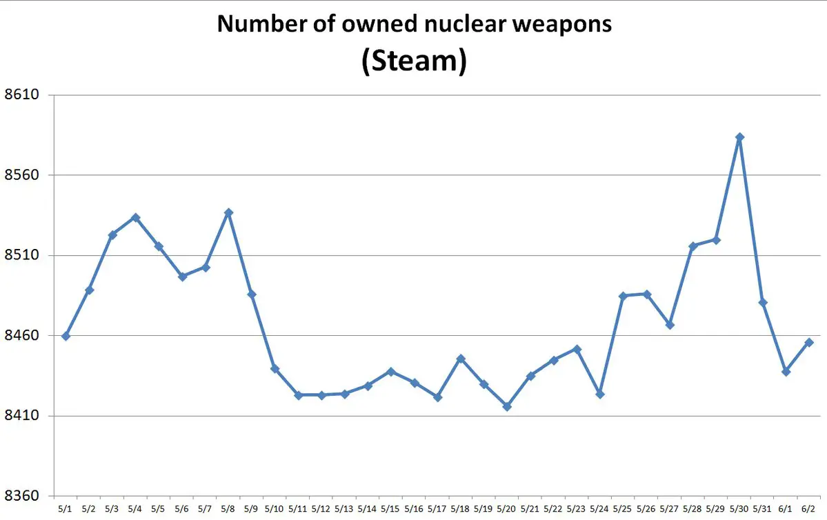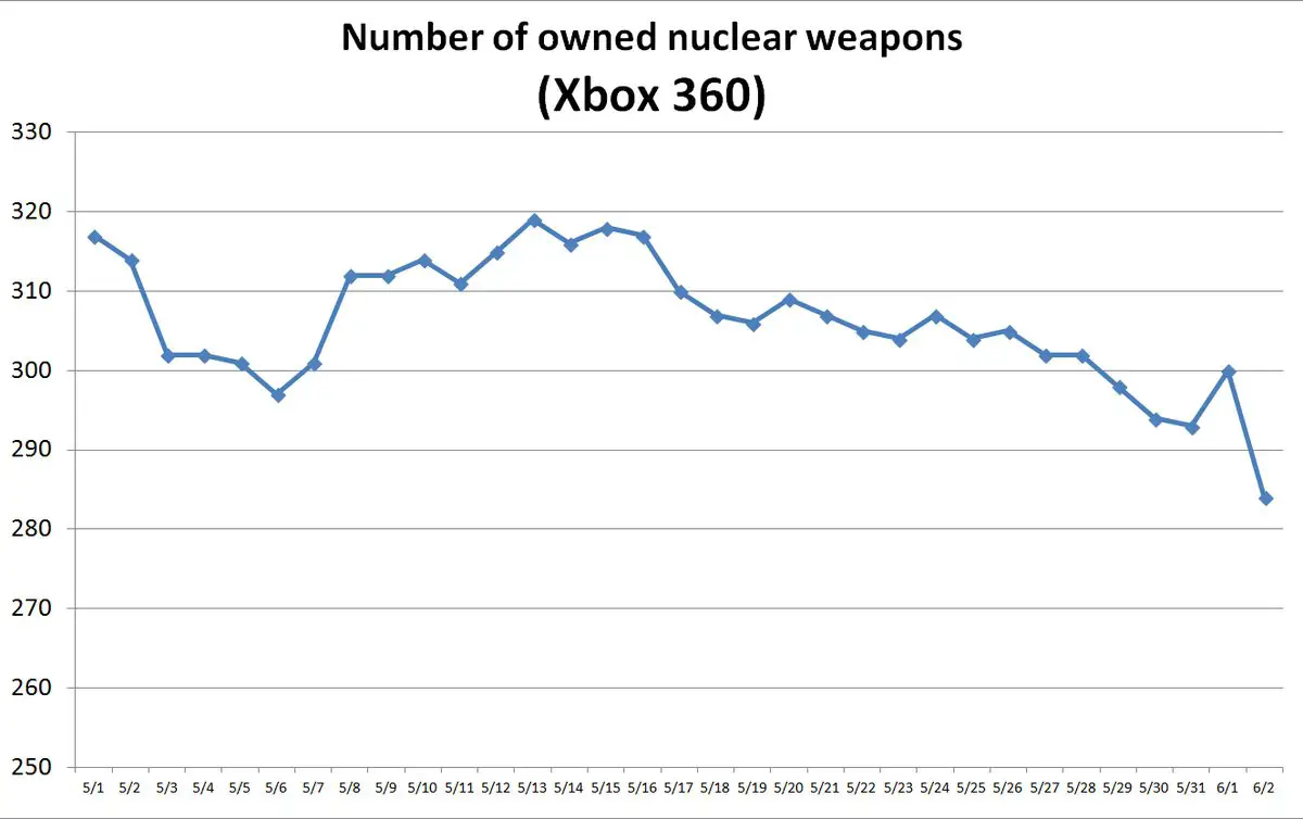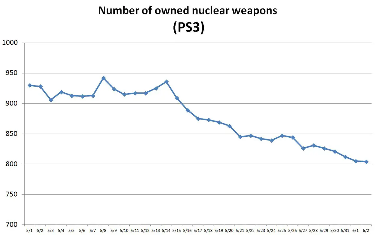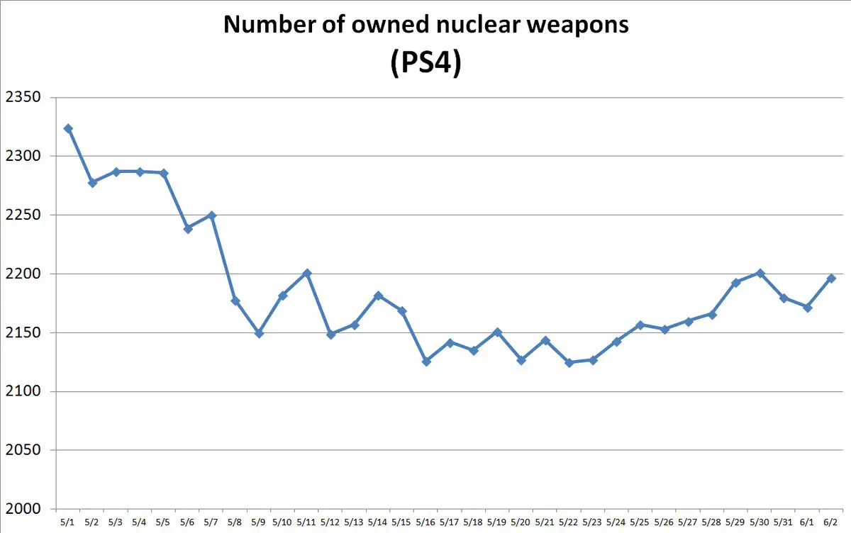 It’s Friday, and that means a fresh update on the total number of nuclear weapons owned in Metal Gear Solid V: The Phantom Pain. Community Manager J, via the official Japanese Metal Gear Twitter has released a new set of graphs showing nuclear weapon ownership between May 1st and June 2nd.
