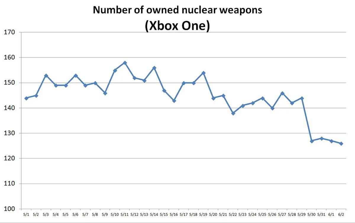 With the exception of PlayStation 4, all platforms saw a decrease of nukes since the last update, some more significant than others. On Xbox One still has the lowest count, and sits at 126. A good development as the last update saw an increase on most platforms.