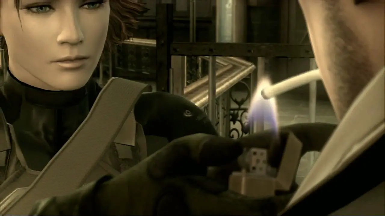 Then she tells Snake he is now walking around with a deteriorating virus that will become a biological threat in about three months. The only way to stop this from turning into a potentially devastating epidemic is for him to take his own life before that happens. Snake once again lights his cigarette, and this time, Naomi doesn’t stop him. Instead, she turns away reluctantly, and lets him smoke. The cigarette is directly linked to Snake’s self-chosen death.