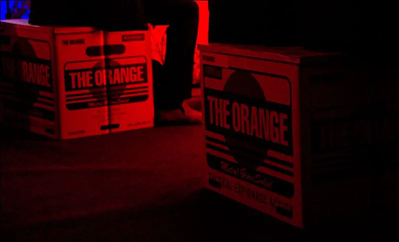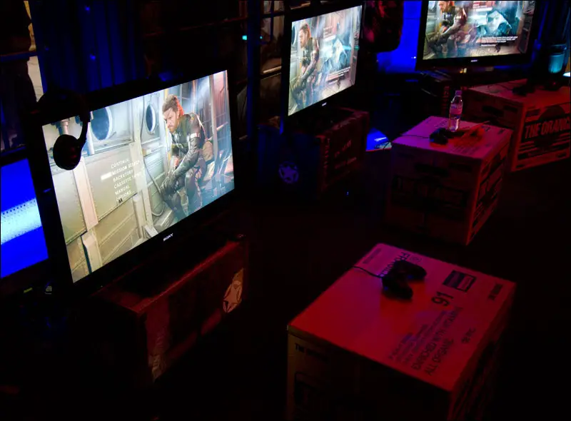The presentation was also really nice: the tvs were sitting on wooden crates, with in front of them the famous MGS ‘orange’ cardboard box to take place on.
